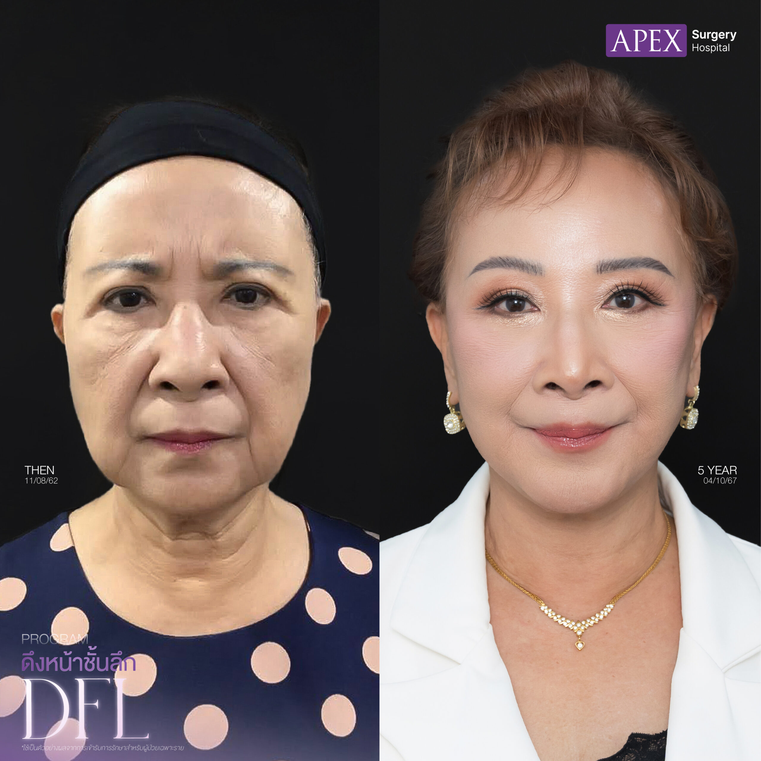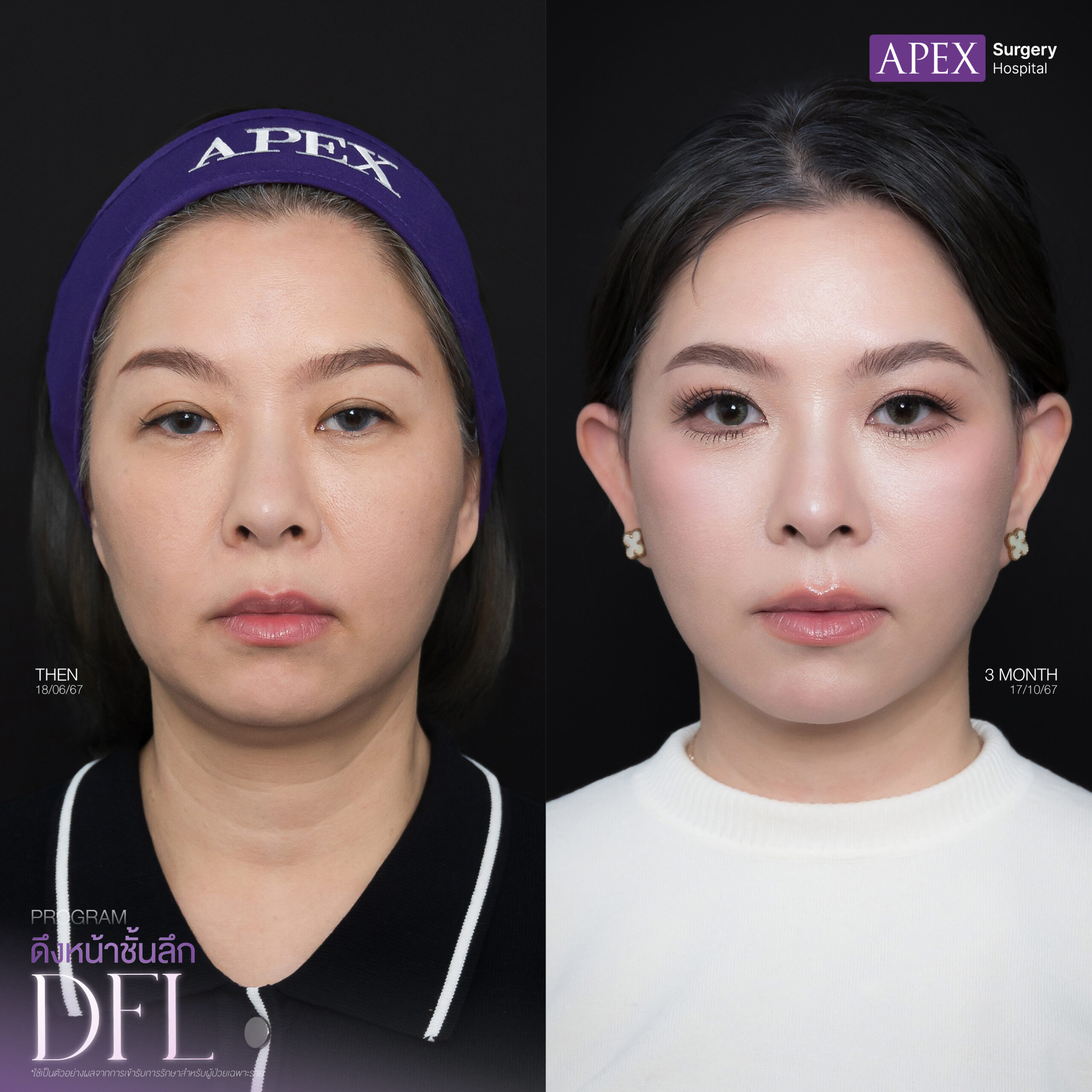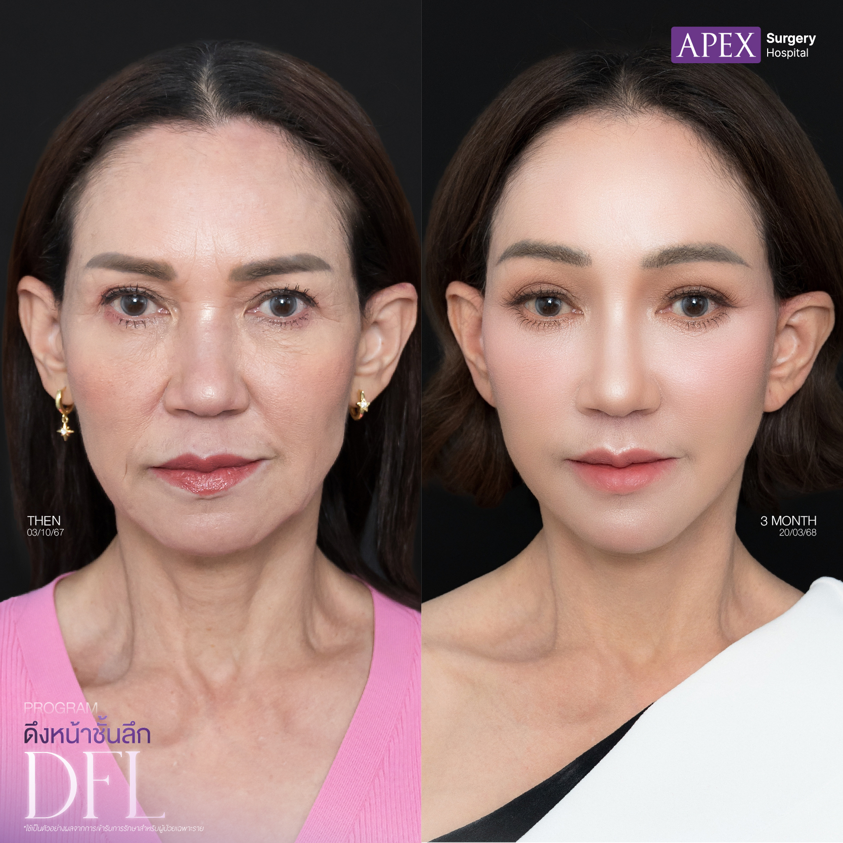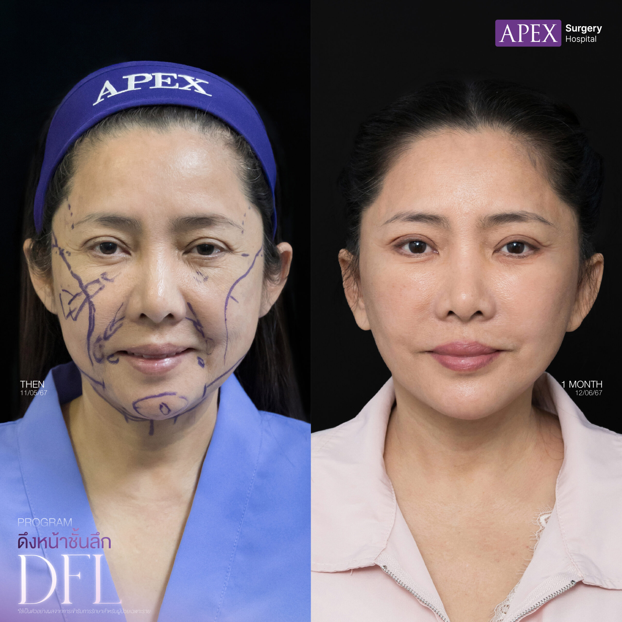 สำหรับในส่วนของการทำ ศัลยกรรมดึงหน้า หรือ Face Lift ทางด้าน APEX Surgery Hospital จะเป็นการผ่าตัดดึงหน้าชั้นลึก DFL Techniques (Deep Plane Facelift) เป็นการดึงหน้าเทคนิคใหม่ที่พัฒนาไปอีกจะลงลึกกว่า SMAS เพื่อปลดล็อก Ligament ที่อยู่บริเวณใต้ชั้น SMAS ผลที่ได้คือ จะช่วยให้แพทย์ สามารถดึงกล้ามเนื้อและผิวหนังได้มากขึ้น ทำให้ใบหน้าดูยกกระชับขึ้น ไม่ตึงรั้ง และให้ผลลัพธ์ที่สามารถอยู่ได้นานมากขึ้นส่งผลทำให้เกิดผลลัพธ์ที่ดี ใบหน้าของลูกค้าจะยกกระชับขึ้น แลดูอ่อนเยาว์ มีความสดใส สามารถย้อนวัยได้อย่างเห็นผล และที่สำคัญมีความปลอดภัยสูงอย่างแน่นอน